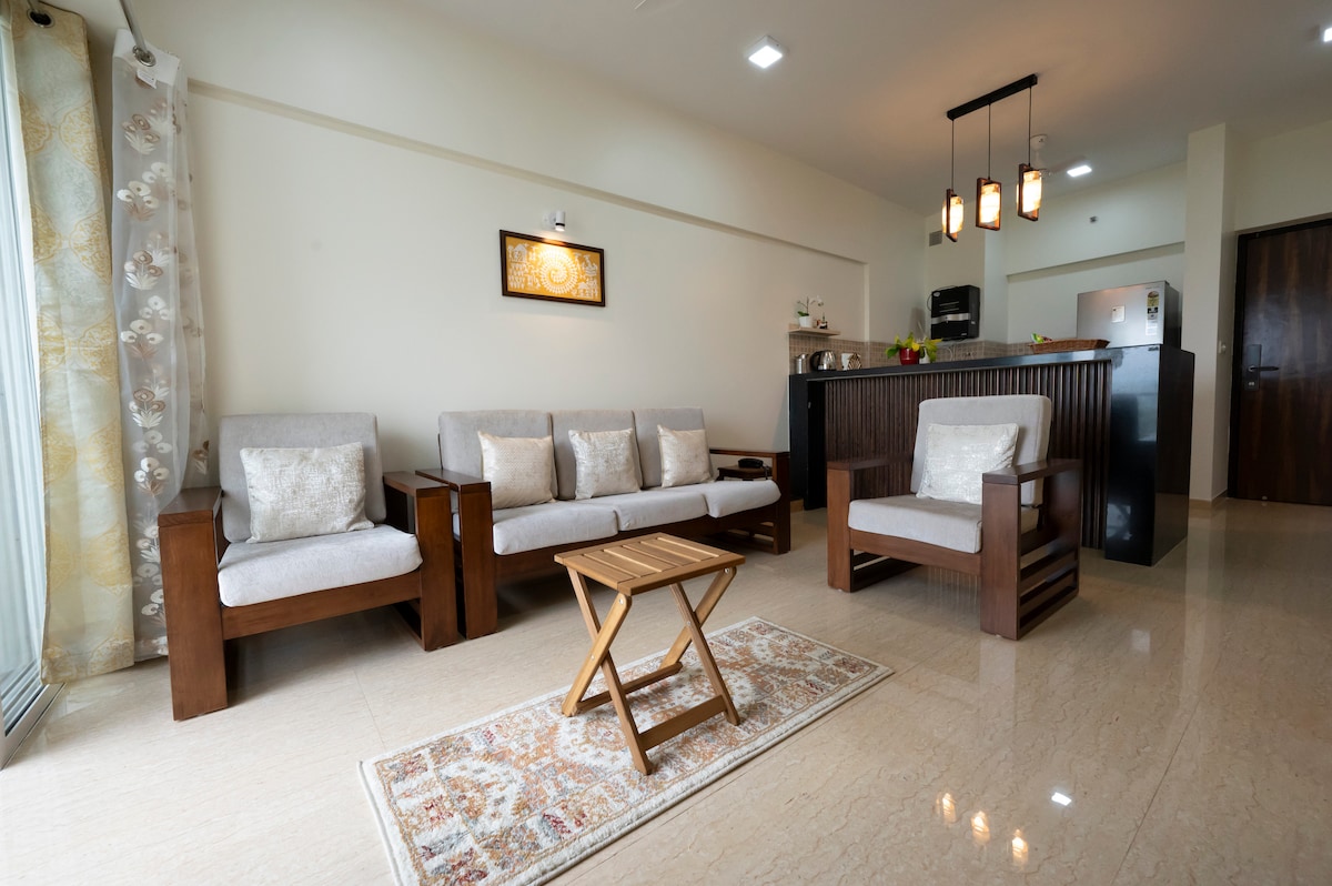 Step into a world of serenity as you open the door to "Breathe." This thoughtfully designed luxurious one bedroom apartment in a 40-acre golf property is a sanctuary amidst the bustling city life, offering you a peaceful retreat to relax, unwind, and recharge. Located near Mumbai – Pune expressway, makes this property perfect for a quick visit to Pune city or just have a weekend getaway. The apartment offers panoramic views of the golf course, river, and mountain range.