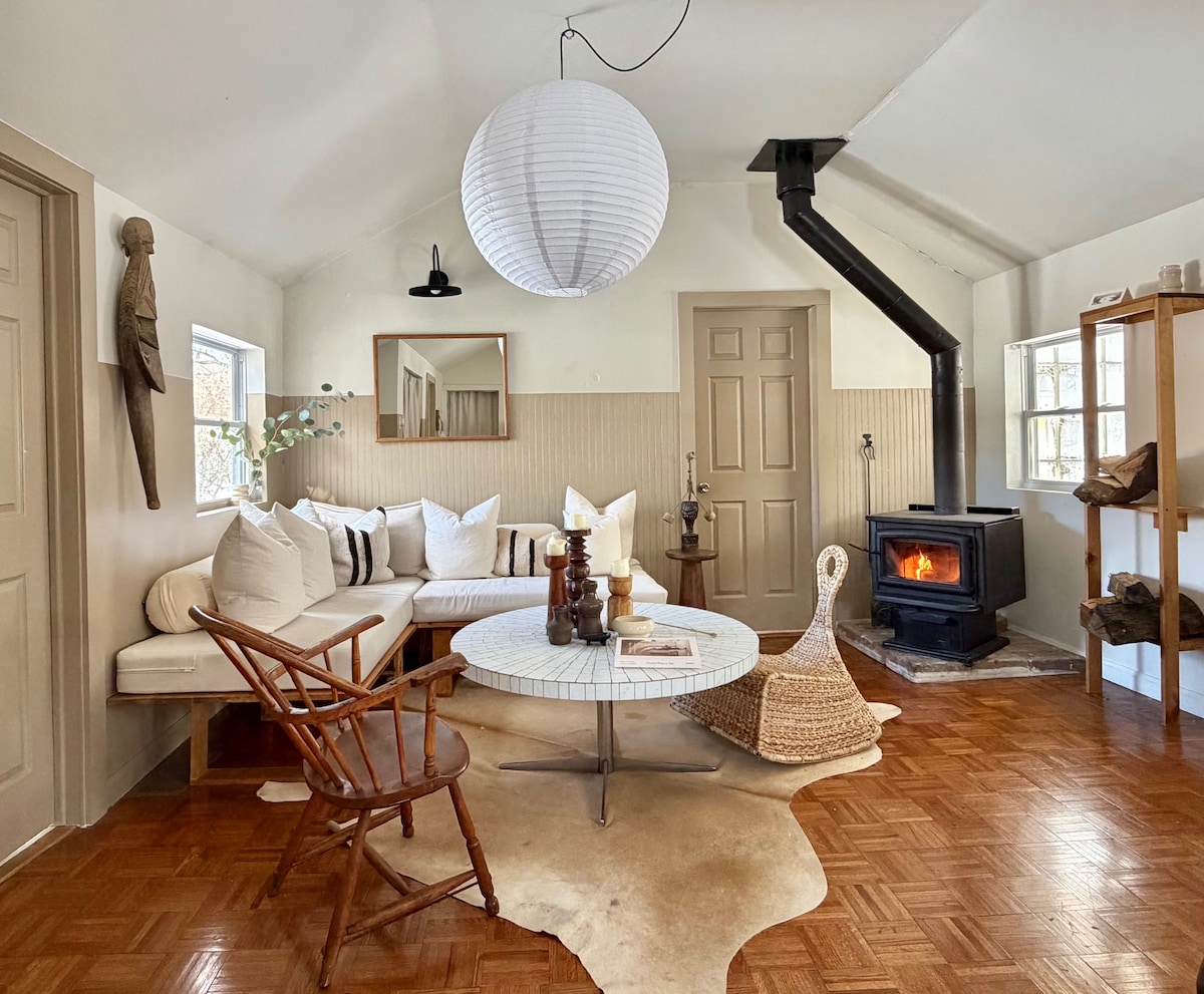 Welcome to our stylish glamping cabin! Relax in the spacious yard & sunny deck. Cozy fieldstone fireplace, vaulted ceilings & skylights. The cottage features gorgeous pine wood & fantastic interior design. Unwind in the reading nook, master bedroom with skylights, or put on your favorite vinyl. Kids will adore the sleeping loft. Just a 9-minute walk or 2-minute drive to the public beach (the beautiful Stockbridge Bowl). BBQ grill, outdoor fire pit . Tanglewood is just minutes away.