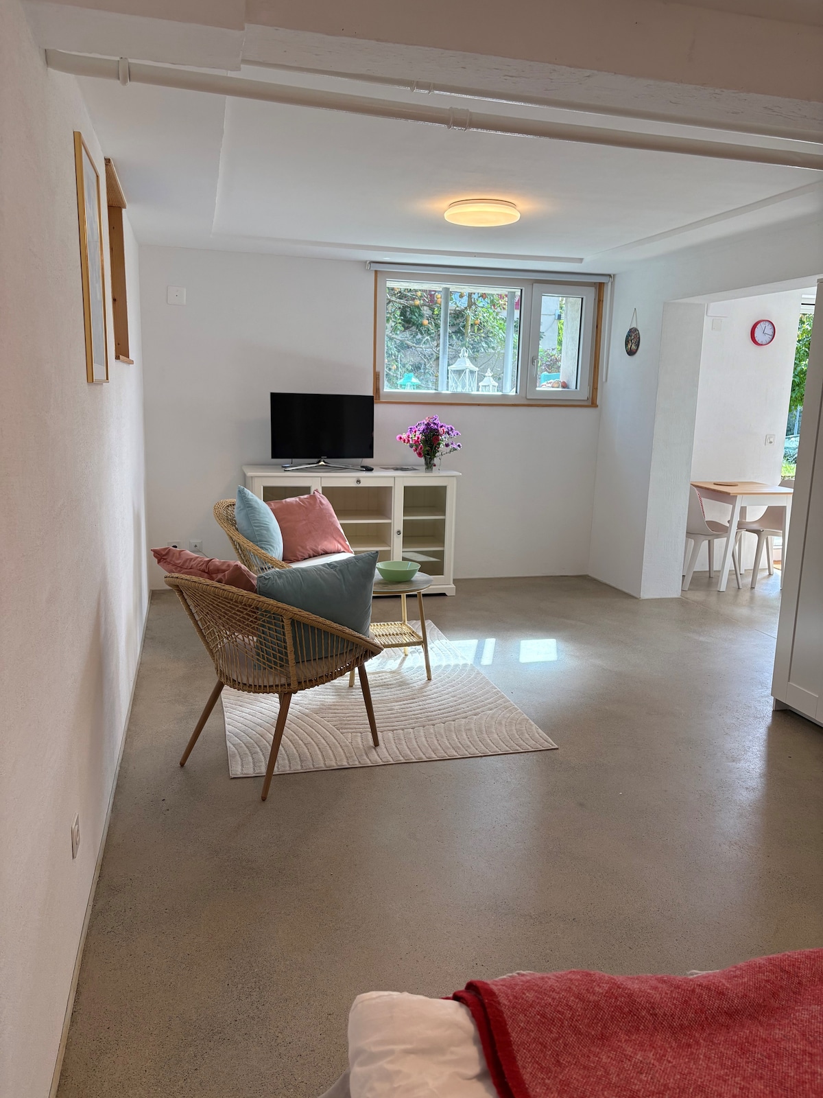 Wir vermieten eine sehr schöne, neu möblierte und gemütliche 30m2-Wohnung mit separatem Schlafzimmer. Im offenen Wohnzimmer mit Küche und Essplatz hat es ein grosses Bettsofa. Die Wohnung hat einen separaten Wohnungseingang und befindet sich im Erdgeschoss (keine Stufen), der gratis Parkplatz ist direkt neben der Wohnung. Die Wohnung liegt mitten im Dorf und ist einfach zu finden. Nur drei Minuten zur Bushaltestelle, 40 Minuten nach Zürich. Wir, die Gastgeberfamilie, wohnen im Obergeschoss.