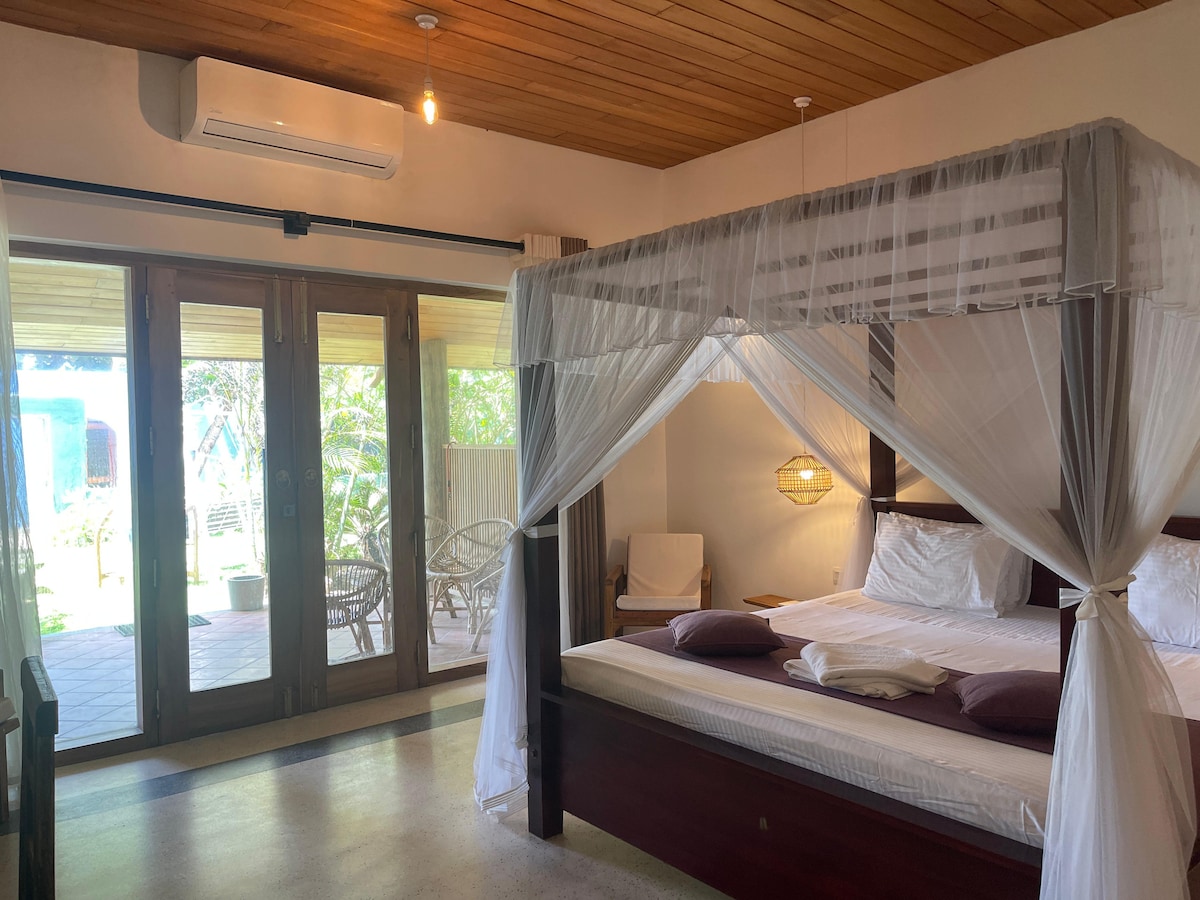 The Palm Lanka is a peaceful, unique and luxury villa near Tangalle.Featuring four ensuite bedrooms, rooftop terrace, yoga and fitness studio, cold plunge, open garden kitchen/bar and swimming pool overlooking lush palmtree garden. Relax in a new villa, bright room with balcony and private bathrooms. Every day we get visits from colourful birds, monkeys and you can even hear peacocks singing. We have the best team: Manel and Suresh who will take care of all your needs and also nightly security.