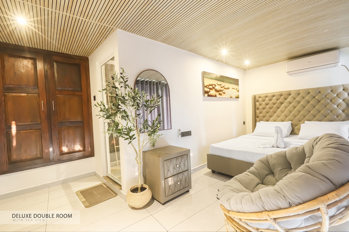 With AC Fall asleep to the sound of the ocean at our peaceful haven in the heart of idyllic Madiha village. Each of our three double bedrooms has a comfy double bed with brand-new mattresses, bespoke Sri Lankan-made furniture including a desk and chair, polished cement bathrooms with airy showers, and a private terrace. Your private deck unfolds directly into our cafe and restaurant where delicious breakfasts, lunches, and dinners await.