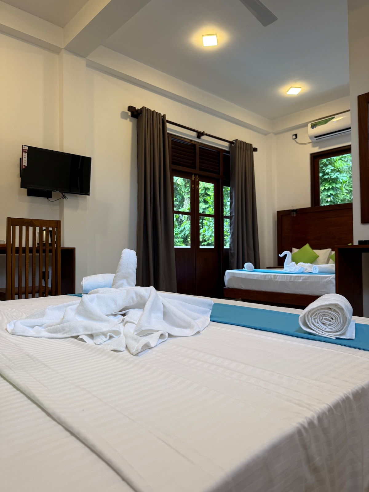 Immerse yourself in the lush greenery of Sri Lanka in Tailslide Surf House's jungle-view double rooms. These spacious and cozy rooms provide a serene escape, with windows opening to peaceful views of tropical foliage. Designed for relaxation, each room features a comfortable bed and a private bathroom, perfect for unwinding after a day of surf or exploration. Enjoy the tranquility of nature while being just steps from the vibrant surf scene and local attractions.