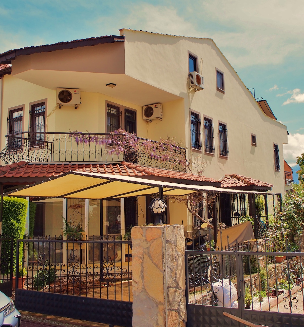 It is 2 km from the sea, the beach, 1 km from the market, 10 km from the center of Fethiye, and 25 km from Ölüdeniz. It is located in Fethiye Çiftlik area. It is a villa built in 2023, fully furnished with modern furniture, with its own pool and garden, and also a jacuzzi. It has a peaceful environment for the family, and we have a high chair and a park bed for your babies.