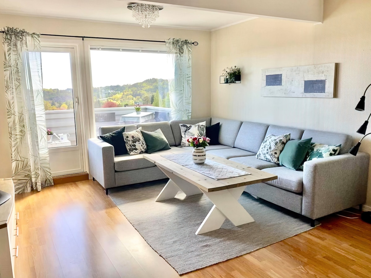 Kosel og landlig ferieleilighet over 2 etasjer.Barnegrind på terasse og inne ved trapp 2 soverom med dobbeltsenger, 2 gjestesenger 90 cm ,da den øverste madrassen er behagelig tempur madrass. 1 bad med vaskemaskin og dusjkabinett .Stor terasse.Gassgrill og utemøbler.Stor plen. Kort avstand til sjøen og Dyreparken ca 7 km.15 min gange til fiske og badeplass ved sjø.Sørlandsenteret ligger rett ved Dyreparken.10 km til Sommerbyen Lillesand og 20 km til Kristiansand