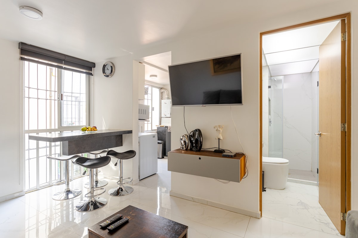 Beautiful Studio-Apartment with an excellent location in the middle of the trendy and fun Roma-Hipodromo-Condesa neighborhood. The area has excellent public transportation options, such as a 5 minute walk to the Metro and MetroBus station "Patriotismo". It is equipped for extended stays with: high speed internet, Smart TV (with cableTV, international news channels, Netflix), a double bed, work table, a fully equipped kitchenette, a safe, and a functional bathroom.