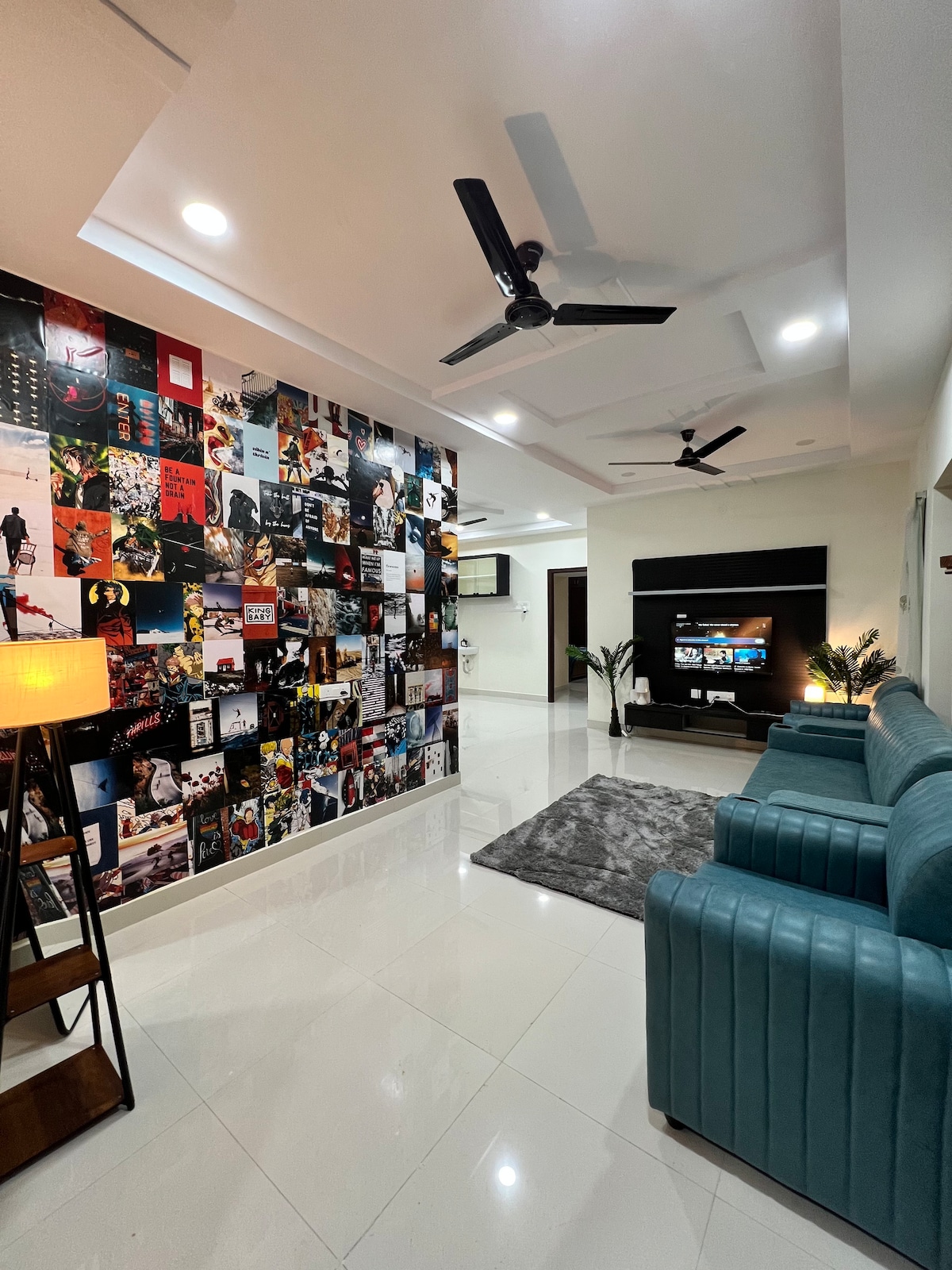 Indulge in a luxe triplex villa with serene lake views near Kondapur in the heart of the city- Hyderabad. Elegant interiors, a private projector lounge,indoor board games, a curated book collection and a sunset terrace create the perfect escape.Spacious yet tranquil, it’s ideal for families & friends seeking sophistication. Thoughtfully designed for comfort, every corner offers a mix of style and warmth. 25min to Hitech, 20 to AMB Gachibowli, 50 min to Airport.
