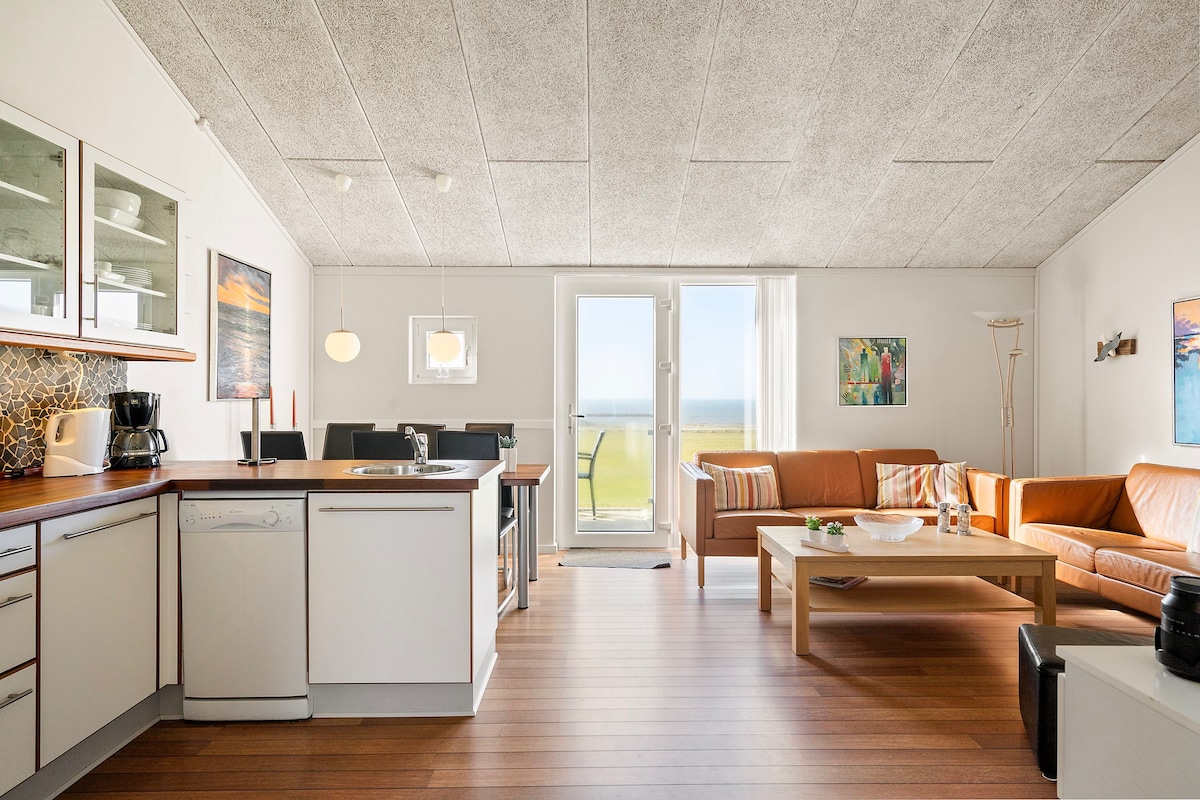 Chamerende retro-indrettet sommerhus, med en berusende havudsigt. Nyd solnedgangen over kliterne fra det kombinerede køkken og opholdsrum. Eller slap af en kold vinterdag foran brændeovn med se på det brusende Vesterhavet. Stue med hyggelige sovealkove, incl havudsigt. 2 soveværelser, badeværelse, samt en hems med plads til yderligere 2 personer. Note: Prisen er plus rengøringsgebyret på 750 dkk (for ophold over 3 døgn, ellers 500 dkk for ubeer 3 døgn). Gebyret afregnes ved afrejse.