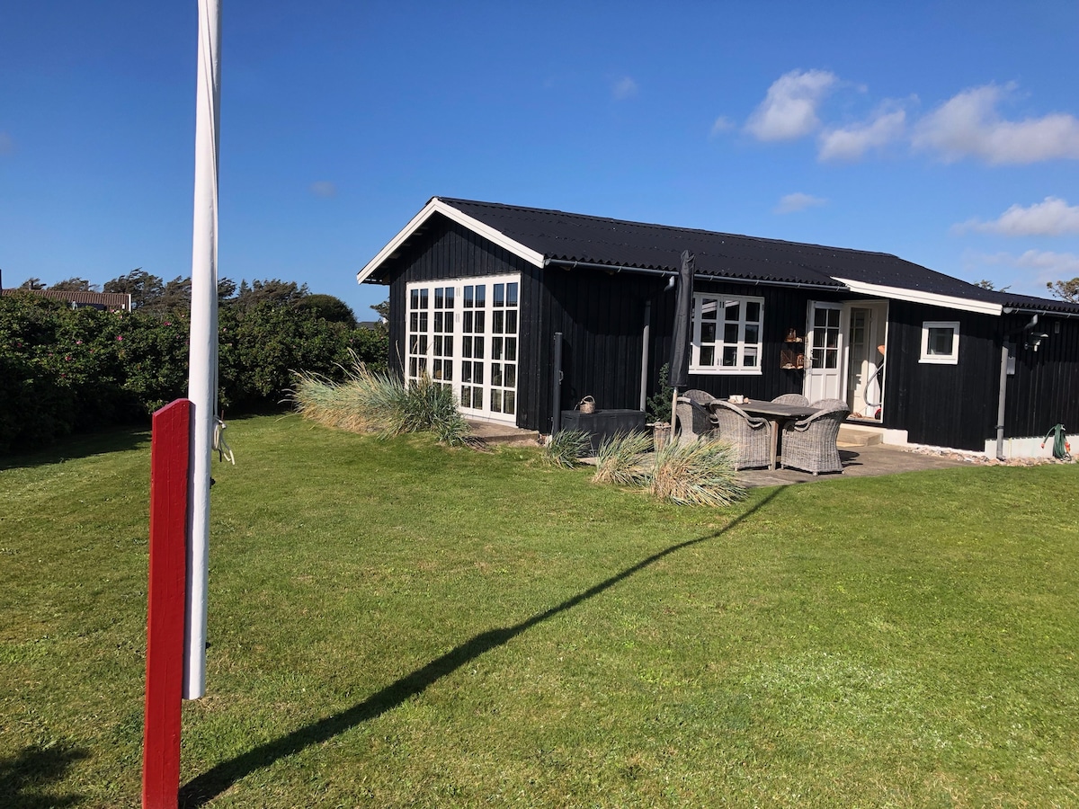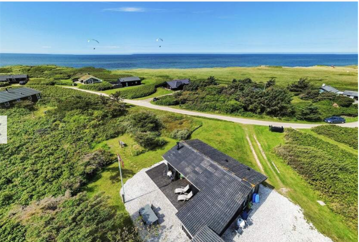 sommerhuset ligger kun 500 meter fra Vesterhavet og en af Danmarks bedste sandstrande. Fra huset og terasserne er en skøn havudsigt. Huset er fra 1966 og med en bevaret charmerende stil. De 48 kvm indeholder stue, køkken, badeværelse og 2 soverum hver med seng på 140:200. Udenfor er der terasser mod øst, syd og vest med gasgrill. Endvidere et udebad, og et Vildmarksbad som kan anvendes mod betaling. El afregnes: 4 kr pr kWh. Pengene afregnes ved afrejse i dk kr eller euro i kontanter.