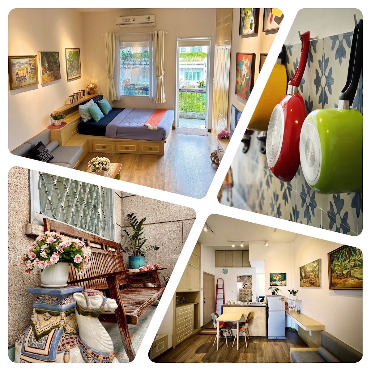 A unique 60sqm studio hidden in an alley in the heart of Saigon, offering both privacy and convenience. Located on the 2nd floor of a townhouse, right above cozy BeanThere Café on the ground floor, it’s perfect for guests who love stylish living and great coffee just steps away. Only minutes from famous attractions, shopping malls, and vibrant nightlife. Each guest enjoys 1 complimentary breakfast per night (1 food + 1 drink combo). Free housekeeping for stays over 4 nights with 1-day notice.