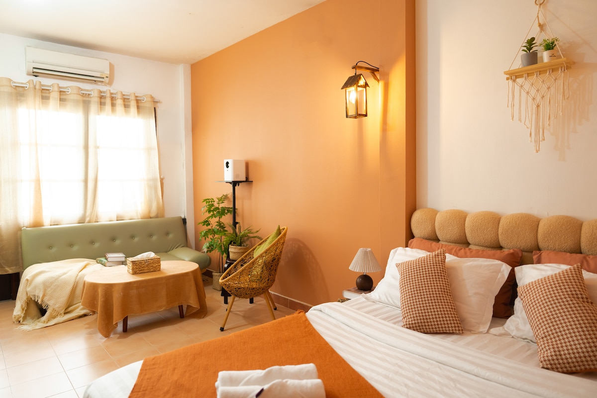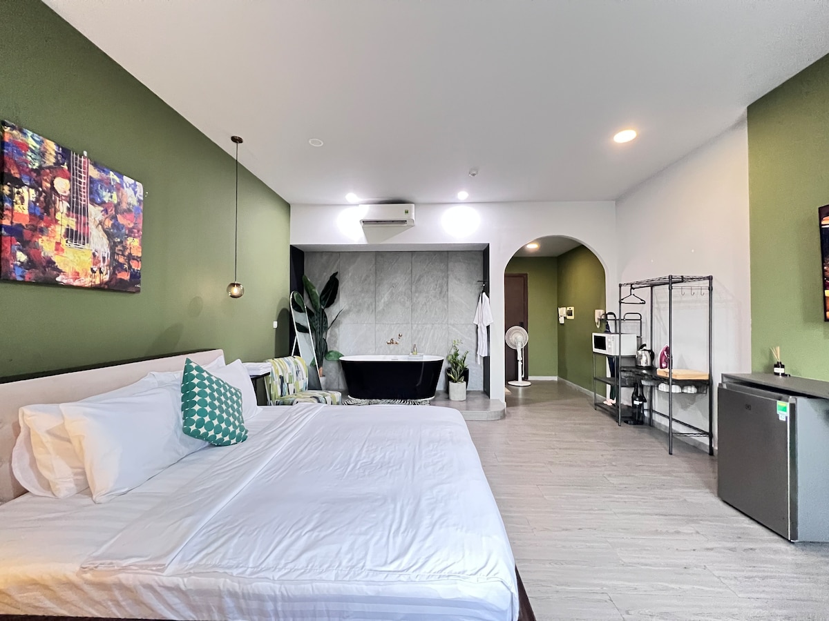 Studio apartment with unique design located in a lovely alley in Saigon Center. The studio is located on the 2nd floor of a townhouse, of which the 1st floor is the lovely BeanThere cafe. It only takes a few minutes to reach attractions and nightlife activities. Besides, there is also a kitchen to cook basic meals. One breakfast (01 food and 01 drink) / guest / night in Beanthere cafe. We offer free housekeeping for bookings longer than 4 nights. If needed, you can notify 1 day in advance.