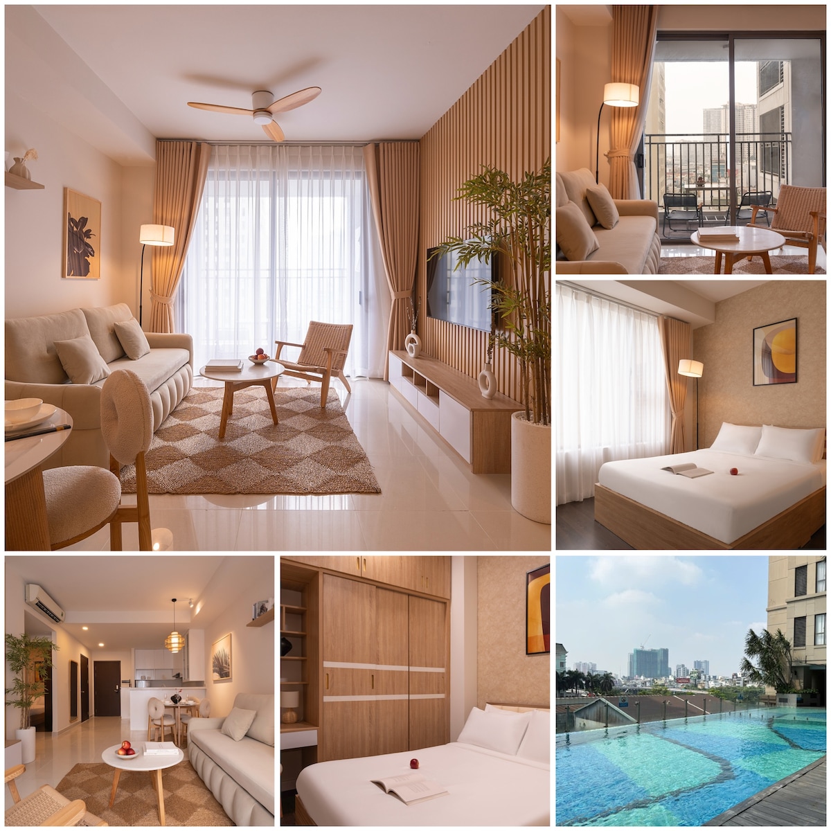 The apartment is beautifully designed in Wabi Sabi style located in D1Mension Residences building, District 1 apartment center, artistic style, high-class resort amenities, special rooftop swimming pool _ spa pool _ sauna room, gym_ showroom, private office, garden fish pond, 4' pizza right in the lobby, garden BBQ area, children's play area, spacious waiting room, All bedroom windows and balconies are airy, unique, luxurious, classy apartment