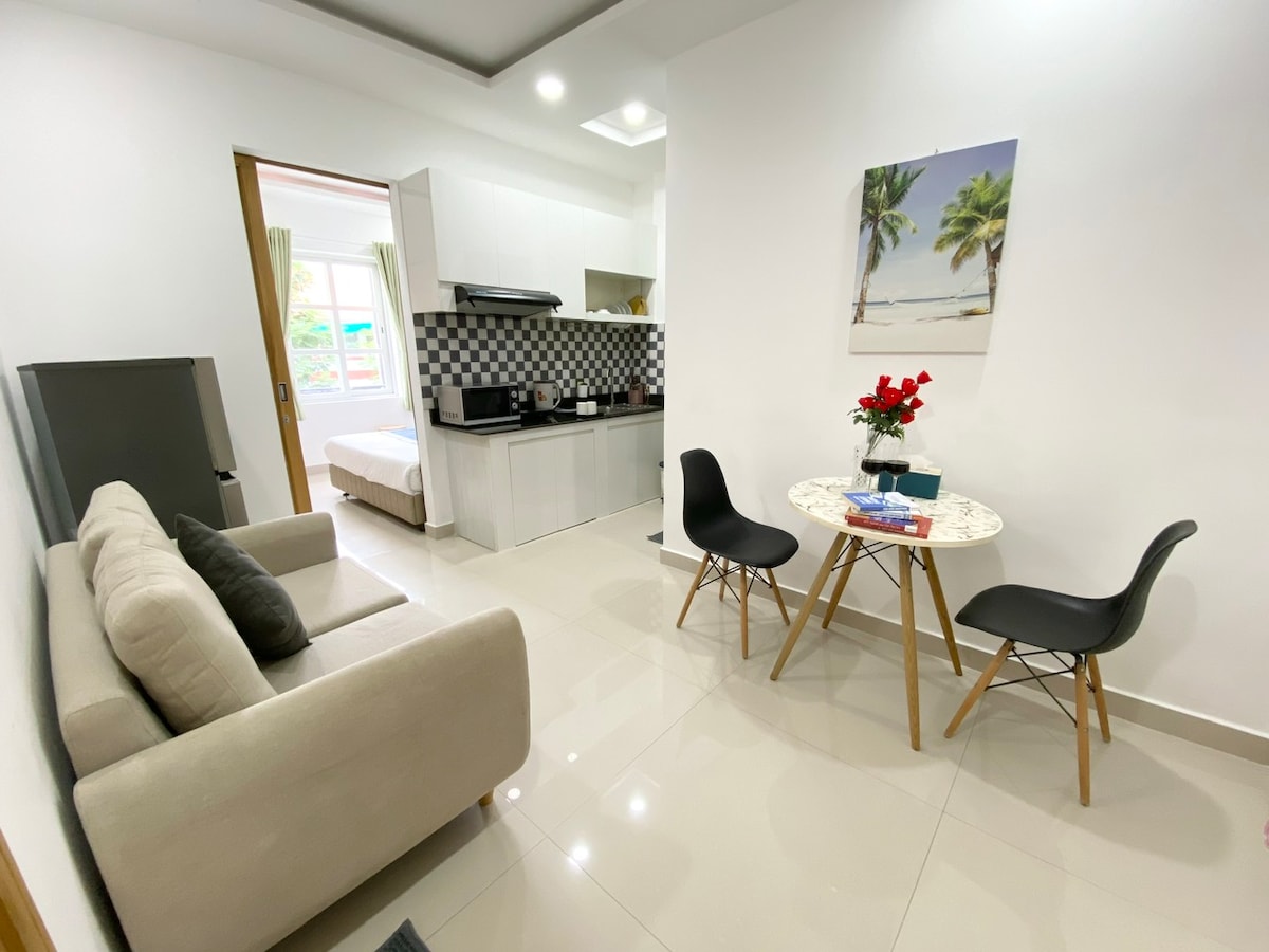 A beautifully designed studio apartment with everything you need, centrally located but hidden away just enough for a peaceful night of sleep away from the heavy city noise. Great for travelers who want to explore Saigon and looking for quality comfort and a more local experience. - Beautiful swimming pool - Free fast wifi, Cable TV - Free amenities for your living: washer, dryer, AC, fridge, hot water - Kitchen with enough tools for your cooking. Note: Not provide/support VAT invoices