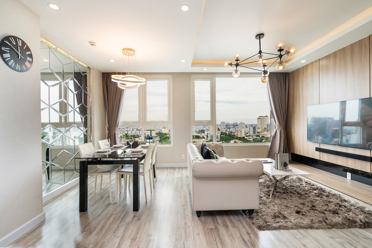Căn hộ được thiết kế sang trọng với tầm nhìn skyline toàn cảnh thành phố, mang lại không gian thoải mái và hiện đại. Vị trí ngay trung tâm nên rất thuận tiện di chuyển, xung quanh có nhiều siêu thị, cửa hàng tiện lợi, quán cà phê và nhà hàng nổi tiếng. Có thể dễ dàng đi bộ đến công viên và nhiều địa điểm tham quan du lịch trong khu vực, chỉ vài phút đến Bitexco Tower. Phù hợp cho kỳ nghỉ thư giãn, khám phá thành phố hoặc chuyến công tác ngắn ngày. Không gian đầy đủ tiện nghi cho một kỳ nghỉ.