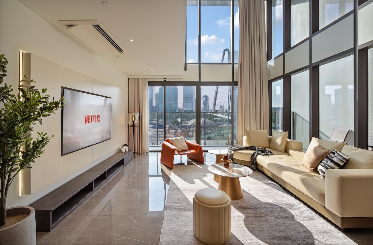 Welcome to TrueStay Experience a rare 250m² duplex apartment (2 floors) with a stunning panoramic city view, offering an exceptional sense of space and privacy. This is a one-of-a-kind unit in the area, designed for those seeking a truly premium stay. The highlight is the impressive double-height living room with floor-to-ceiling windows, filled with natural light. Perfect for families or groups looking for comfort, exclusivity, and a unique living experience near the city center.