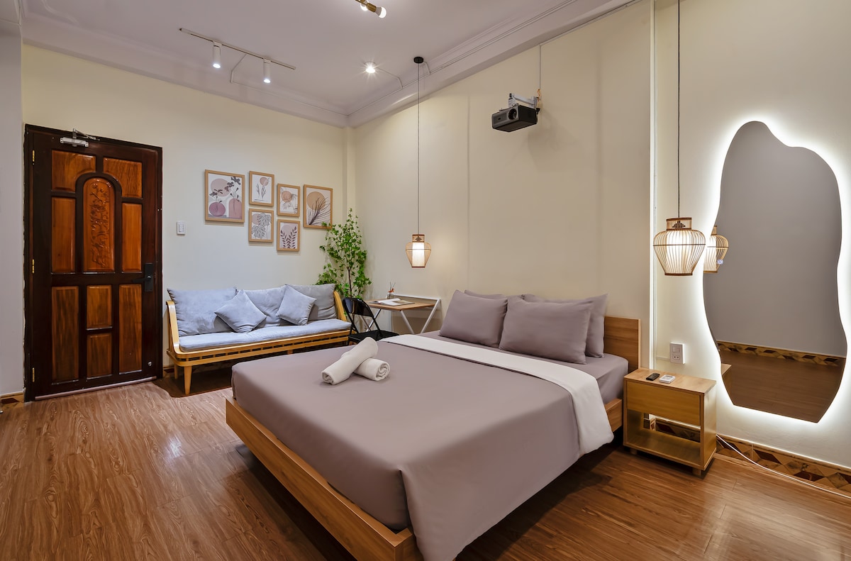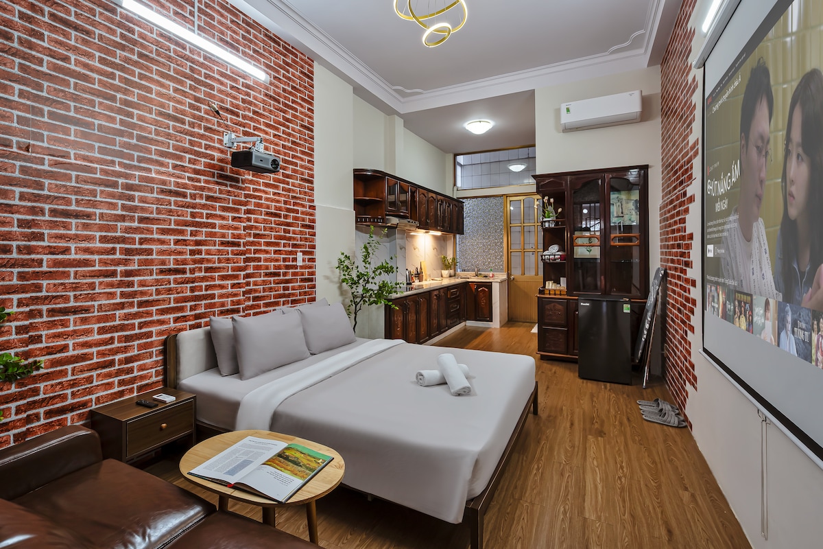 Our bright and spacious space is located in District 1, the heart of HCMC. - Elevator is available - LOVELY STUDIO with FULLY-EQUIPPED KITCHEN and WINDOW - PRIVATE bathroom - Towels are included and changed everyday for free. - FREE wifi, cleaning everyday.