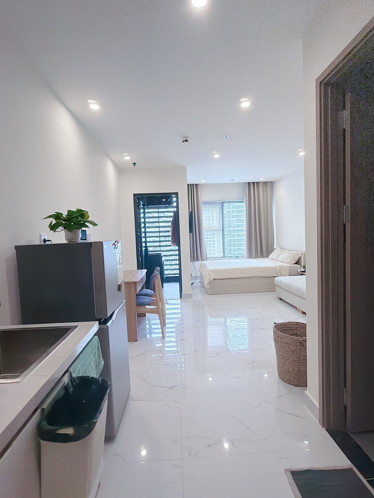 Room 101 là một căn studio tiện nghi nằm ở vị trí tuyệt vời, cách sân bay 3 phút di chuyển và cách trung tâm 10 phút. - Căn phòng được thiết kế với phong cách japandi với full ánh sáng tự nhiên, nội thất gỗ và được trang bị đầy đủ đồ dùng bếp đem lại cảm giác ấm áp như ở nhà - Nằm trên tầng trệt với cửa đi riêng, rất riêng tư và dễ dàng mang hành lý vào. - Phòng được trang bị máy chiếu hiện đại cài netflix giúp bạn dễ dàng xem những bộ phim hay như một rạp chiếu phim mini tại nhà.
