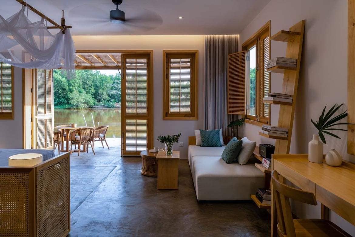 Our Riverfront Cottages feature a private riverside terrace with a stunning view and swimming access to the Ong Keo river, plus an en-suite Balinese style bathroom and rain shower surrounded by tropical plants, an indoor seating area, an outdoor table and chairs plus a hammock. High quality bedding and bathroom amenities complete the stylish furnishings.