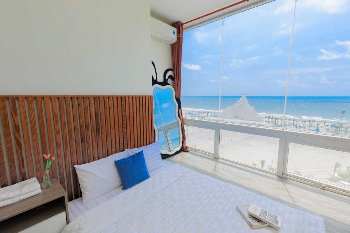 Minimalist, fully furnished 1BR apartment on the 15th floor with spectacular sea views. Ideal for couples or families with one child under 5. Perfectly located beside the Back beach (Thuỳ Vân beach). Estimated walking times to nearby amenities: - 2 minutes to reach the beach across the street - 5 minutes to the nearest 24/7 convenience store (GS25) - 8 minutes to the nearest supermarket (Lotte Mart) Fast elevators. Free Netflix. We also have one motorbike available for rent.