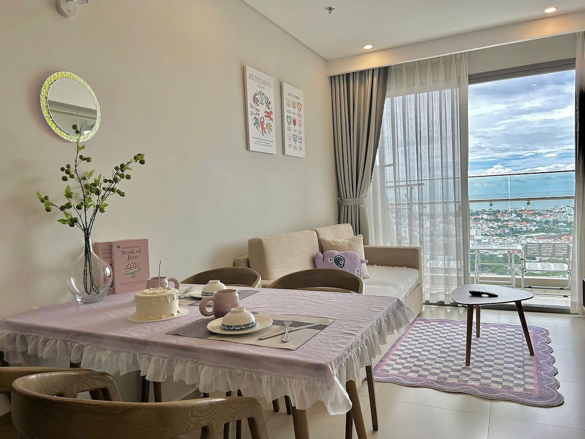 Our apartment has 1 living room, dining space, 1 bedroom (1 double bed and sofa bed), 1 bathroom and the balcony. - The bedroom: Our view from the bedroom is romantic with the view of the grand hill shimmering. We provide air-conditioner, the bed topper, and the bolster. - Kitchen: necessary facilities is provided to cook a delicious meal. - Balcony: spacious balcony with a set of 2 cane-chairs vs 1 table, where guests relax and enjoy the stunning views of the blue sea with a delicious meal.