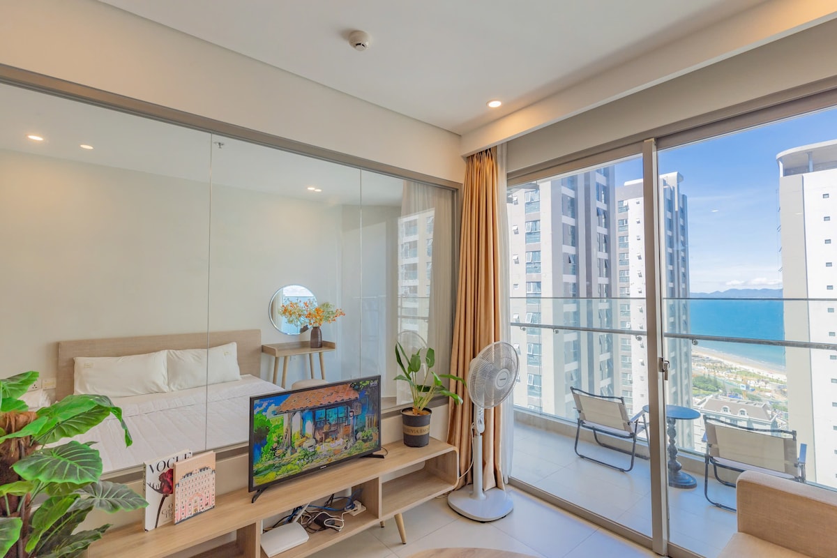 Vị trí trung tâm, cạnh biển, căn hộ có ban công rộng rãi thông với cửa kính lớn hướng ra biển và Thành Phố, mang đến tầm nhìn tuyệt vời để ngắm hoàng hôn hoặc bình minh. Nội thất được thiết kế theo phong cách hiện đại, sang trọng, với đầy đủ tiện nghi. Có đầy đủ các tiện ích như bể bơi, phòng gym, khu vực BBQ, và khu vui chơi trẻ em, thích hợp cho cả gia đình và nhóm bạn. Mặc dù nằm gần khu vực nhộn nhịp, căn hộ vẫn đảm bảo không gian yên tĩnh và riêng tư, lý tưởng cho những ai muốn thư giãn.