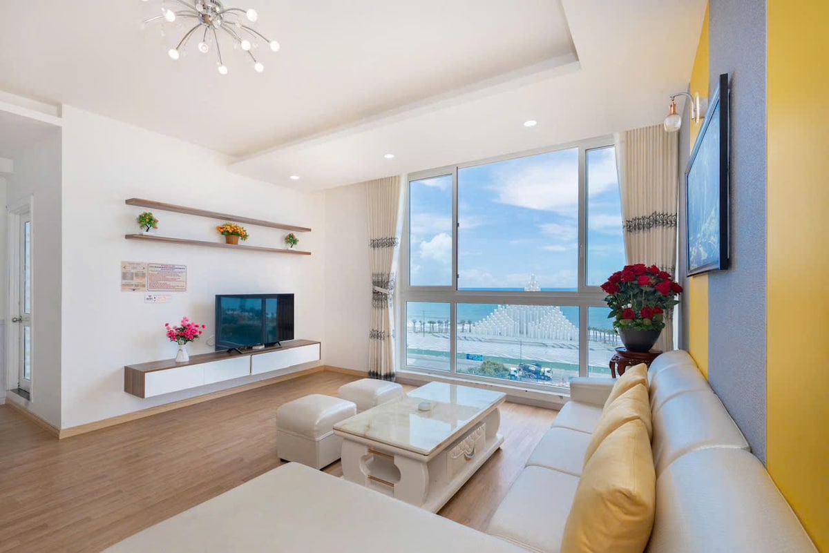 Minimalist, fully furnished 1BR apartment on the 15th floor with spectacular sea views. Ideal for couples or families with one child under 5. Perfectly located beside the Back beach (Thuỳ Vân beach). Estimated walking times to nearby amenities: - 2 minutes to reach the beach across the street - 5 minutes to the nearest 24/7 convenience store (GS25) - 8 minutes to the nearest supermarket (Lotte Mart) Fast elevators. Free Netflix. We also have one motorbike available for rent.