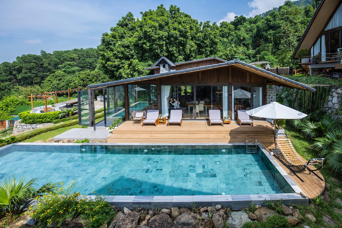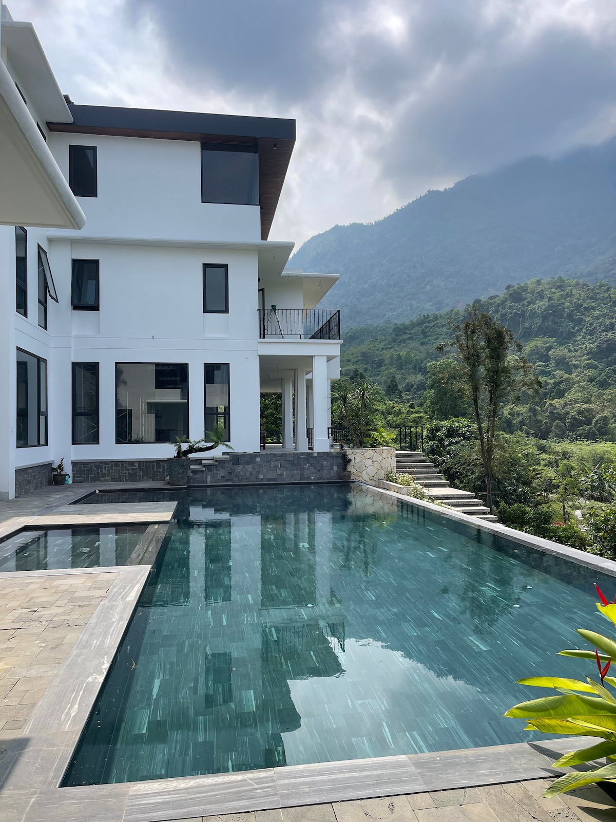 6 PHÒNG NGỦ, ĐÓN 14 KHÁCH( 3 CĂN) Là một khu nghỉ dưỡng riêng tư giữa núi rừng . Khu phù hợp cho các buổi tụ tập ấm cúng cần không gian thoáng – yên bình – tách biệt nhưng vẫn tiện di chuyển từ Hà Nội (chỉ 45 phút). Toàn khu gần 6.000m², bao quanh bởi đồi núi, cây xanh và không khí trong lành. Không gian nổi bật nhất tại khu là hồ bơi vô cực view núi, nơi khách có thể ngắm bình minh, chill hoàng hôn hoặc tổ chức BBQ bên bể bơi cực chill.