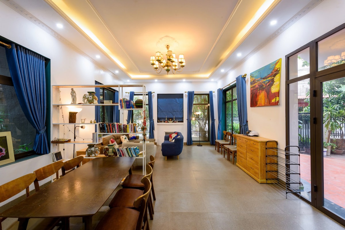 Một retreat yên tĩnh bên bờ sông dành cho gia đình/nhóm bạn: villa 3 phòng ngủ (2 phòng lớn, 1 phòng nhỏ) phù hợp với nhóm 6-10 người, 1 phòng tắm rộng có bồn tắm, bếp đầy đủ, khu giặt sấy, không gian thiền/yoga, phòng khách mở, vườn và chỗ đỗ xe. Vị trí thuận tiện: 2km trung tâm thành phố, 1km ga Ninh Bình, 3km Phố Cổ Hoa Lư, 3km Hang Múa, 4km Tam Cốc, 6km Tràng An. Whole‑villa cho phép nấu ăn; phòng lẻ hỗ trợ light cooking. Không karaoke/loa kéo để giữ không gian yên tĩnh.