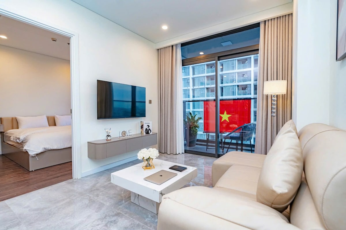 A peaceful, luxurious, and well-equipped place near the beach 🔖 Includes: 👉 2-bedroom apartment, 2 bathrooms, living room, kitchen 👉 Tea corner, balcony 👉 Free drinking water 👉 Free kimono for photos 👉 Fully equipped with TV, refrigerator, washing machine, microwave, rice cooker, electric kettle, hair dryer, etc. 👉 Free Internet 👉 Swimming pool and kids' playground inside the complex Conveniently located near Nam O Beach, Xuan Thieu Beach, Bau Tram, Mikazuki Water Park, and Cu De River