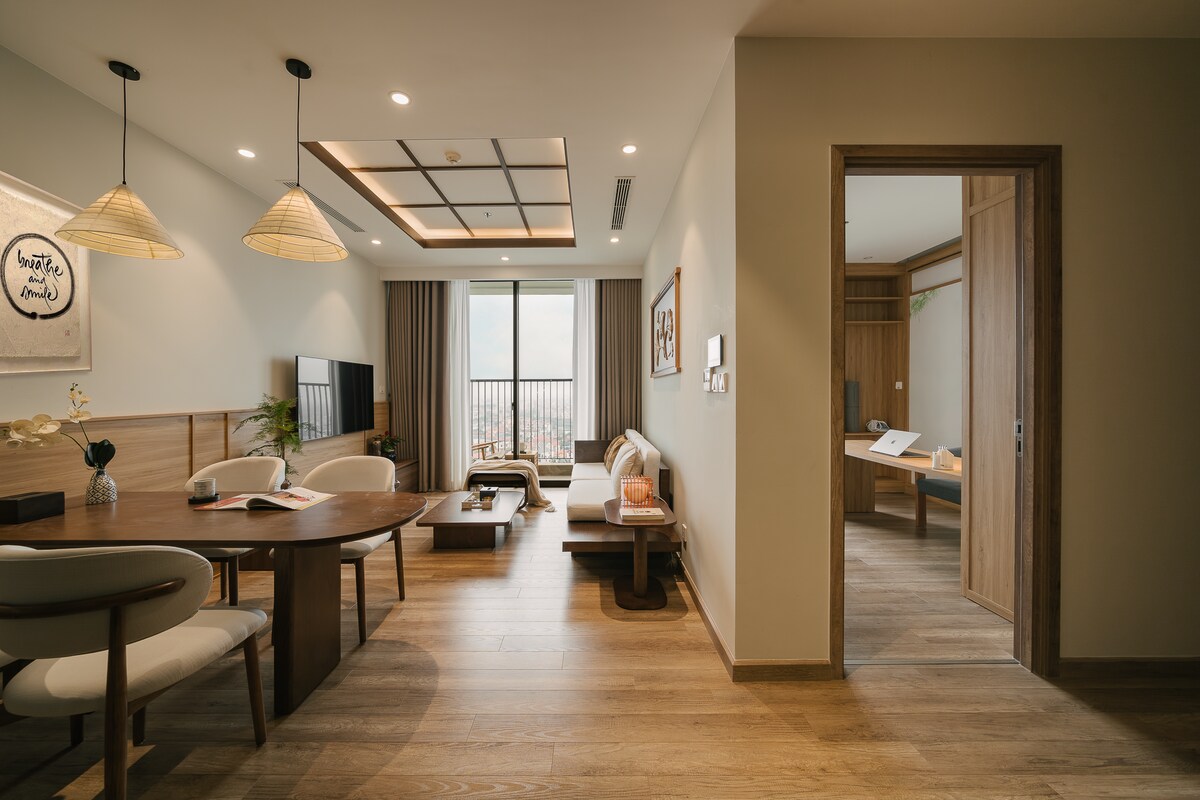 Tucked away in Hanoi’s French Quarter, this 82m² apartment offers an elegant blend of greenery and minimalist design. Inspired by Japanese aesthetics, the space flows gently from room to room, filled with natural light, soft textures, and calming tones. A spacious balcony with lush plants invites slow mornings and peaceful evenings. Every detail is intentional — a quiet retreat in the city.