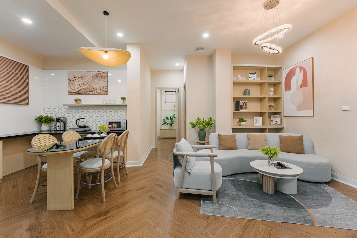 Tucked away in Hanoi’s French Quarter, this 82m² apartment offers an elegant blend of greenery and minimalist design. Inspired by Japanese aesthetics, the space flows gently from room to room, filled with natural light, soft textures, and calming tones. A spacious balcony with lush plants invites slow mornings and peaceful evenings. Every detail is intentional — a quiet retreat in the city.