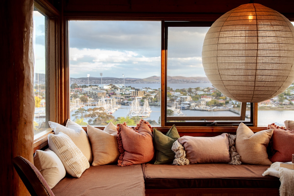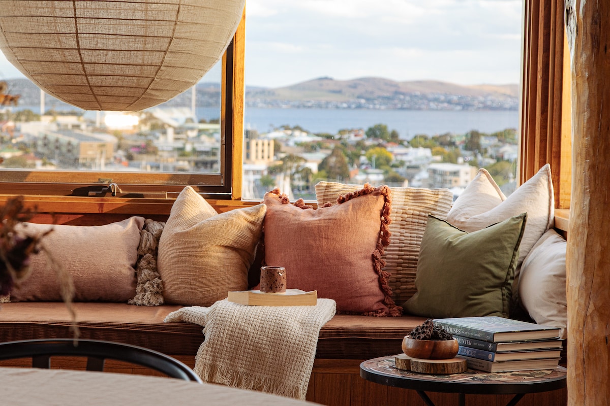 Glasshouse is a one-of-a-kind architectural gem. Perched high, with sweeping views over the Derwent River, it's the perfect place to lose yourself in the ever changing expansive views. Stunning sunrises and moon rises over the water. Nestled in nature with wildlife on the front lawns, yet just a hop, skip, and jump away from vibrant coffee shops, restaurants, and art galleries. Experience floor-to-ceiling windows that stretch across two stories, a loft-style bedroom, and a luxurious bath.
