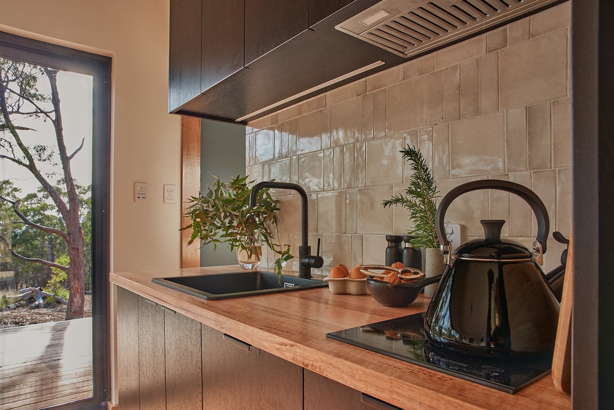 Getaway from the everyday and embrace relaxation. Nestled high on a hill overlooking glorious sunrises/sunsets, rolling green hills and orchards, blue skies and towering green gum trees. Friendly wildlife, twinkling stars and a custom made hot tub are yours when you stay here. Fall asleep on luxurious linen. Feel the quiet stillness of the surrounding Tasmanian bush. Pause from the race of life, rest, recharge, connect with nature and rejuvenate.