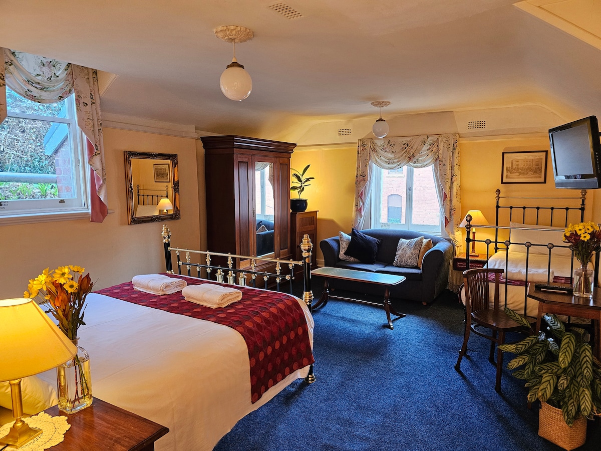 This light filled, ground floor suite has beautiful views from the bay window overlooking the garden and directly out to Mount Wellington, often snow-covered in winter. The antique furniture includes a beautiful Sheraton Revival wardrobe with ample hanging space, big drawers and deep shelves, and its original matching dressing table. Under the bay window you can sit and work at the generous antique table, or relax in a comfortable arm chair with a book from our own collection of old volumes.