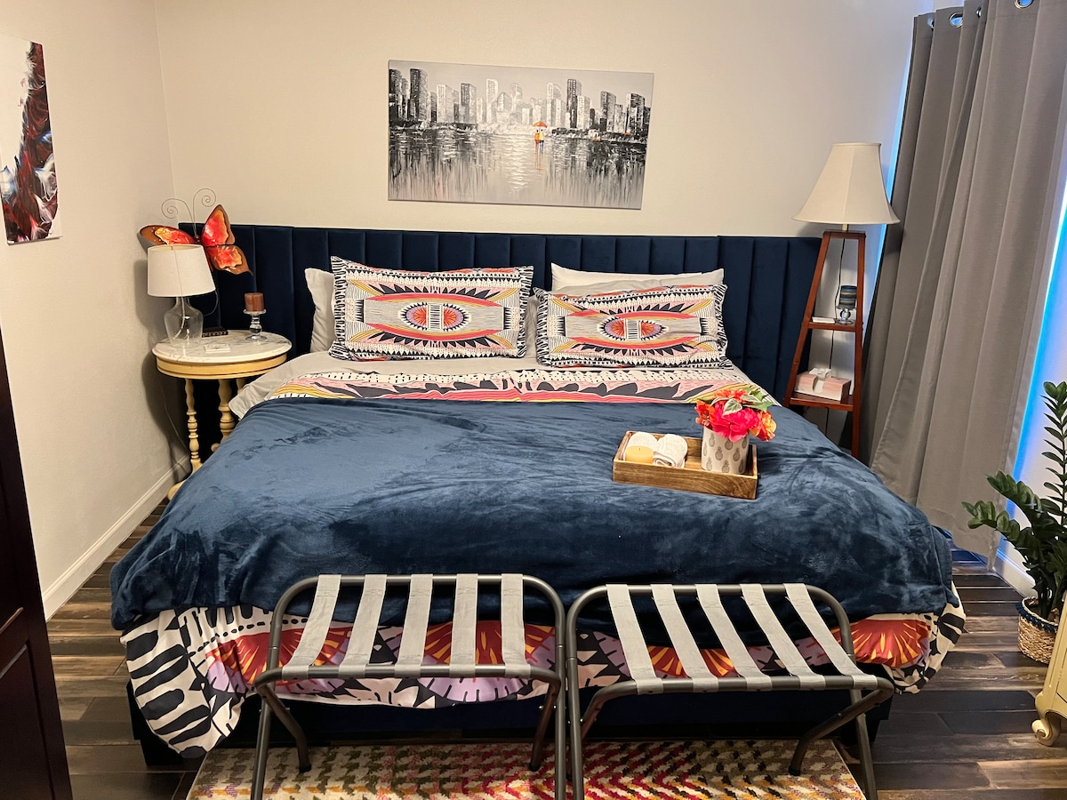 Kick back and relax in this calm, retro modern space. Treat yourself: Coffee bar (drip and keurig), microwave, electric breakfast station (grill top and toaster), refridgerator, and lots of snacks and drinks. Relax: the shower has a built in sauna, and the comfiest bed and sheets ever! There's a really friendly outdoor cat, Felita 🤗and a dog, Samson, that only goes outside if we leave the house during the day, just let us know if you would like him in his giant cage if we leave the house!