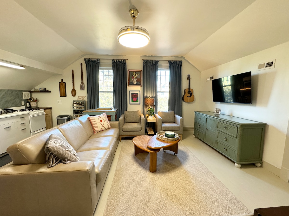 The Duck Inn is a 320 sq ft efficiency apartment adjacent to the Lunker Lodge. It has a private entrance, full bathroom, ample closet space and is furnished with a queen sized bed (new Nectar mattress), and a loveseat with full sized pullout. Kitchen area is equipped with a microwave, toaster oven, hot plate and Keurig coffee maker and basic kitchenware.