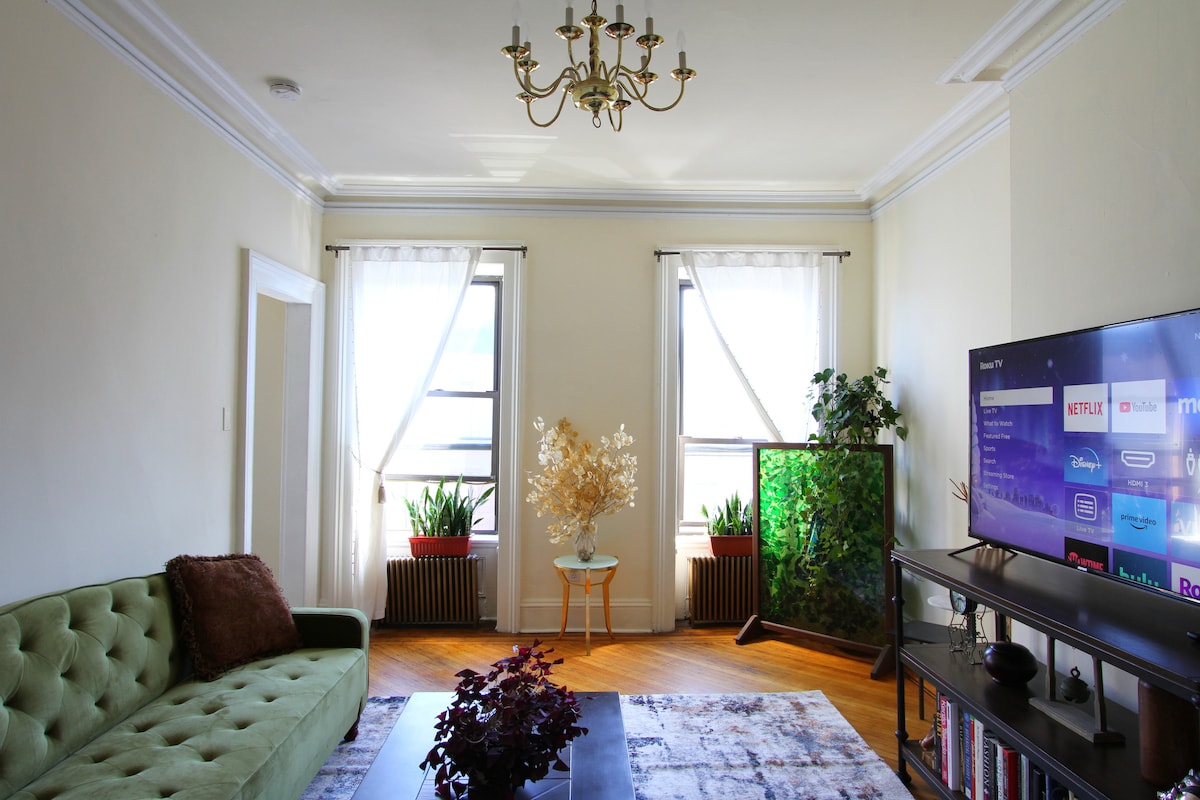 You'll enjoy the entire sunlit 3rd floor of a Victorian Brownstone, adorned with stained glass and lush plants. Hoboken, once ranked the best small city to live in and the most walkable, is a mere 15-minute bus ride from NYC's Times Square, with the majestic Hudson River in between. This trendy town boasts a waterfront view reminiscent of Brooklyn Heights Promenade. Hoboken is rich in history and charm, offering a safe and welcoming haven, making it the ideal place to relax after your travels.