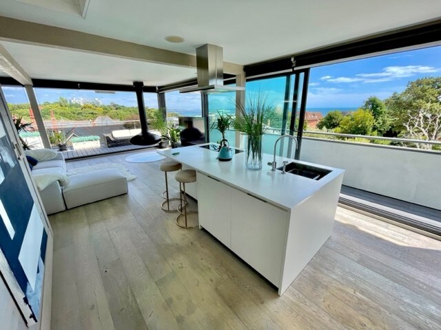 Enjoy your perfect getaway in this award winning 2 bed penthouse apartment with 180 degree sea views in the heart of the tranquil Alum Chine area of Bournemouth just a few minutes walk from the beach. The property boasts two dining areas, one of which sits on the large balcony with views across Bournemouth beach and a bespoke wood burning stove for the winter nights. The open plan kitchen leads onto a cozy living room where you can enjoy Sky Glass TV entertainment through super fast WiFi.