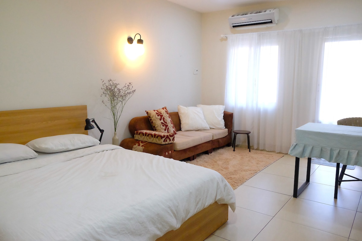 The pictures match 100% with reality so don't worry about the room is different when you come. We provide you a private room with a private bathroom so you can enjoy a peaceful place to work productively or rest comfortably with a queen-size bed and air condition.