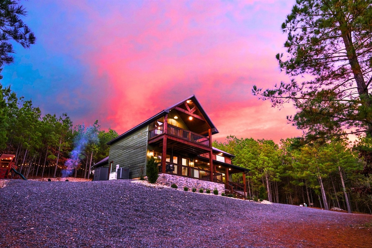 🌲Most-loved family cabin in Hochatown!🌲 🌲Secluded 🔥Fire Pit 🌲Towering Pine Trees ♨️Hot Tub 📍Within the Ouachita 🛏Jumbo 2 bd National Forest 📶Wifi 🕹Arcade w/ 4700+ games 🤯Wraparound Porch 🚿Subway Tile Shower ⚜️Rustic Industrial Design 🌽Stone Cornhole 🛋 Sofa Bed 🤯Wraparound Porch 🪑Elevated Patio 👑King Bed & 2 Queens 🎹Piano 📍<0.5 mi from HWY 259 📘Custom Guidebook