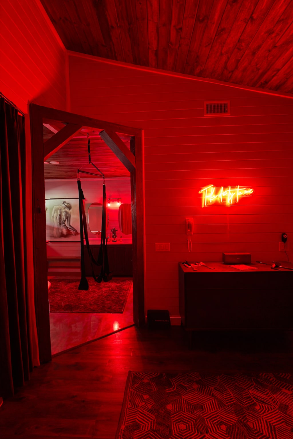 Welcome to Red Sunset, where all of your 50 Shades of Grey fantasies come true. This cabin is curated for consenting adults 25+ that are looking to explore their desires and indulge in activities that you only see in movies. This three story cabin features one king master bedroom with an ensuite bathroom and balcony. The kitchen and living room have a juke box, poker table, and wood burning fireplace. Downstairs, you will find a red room with a swing, cage, pole, and other spicy amenities! ;)