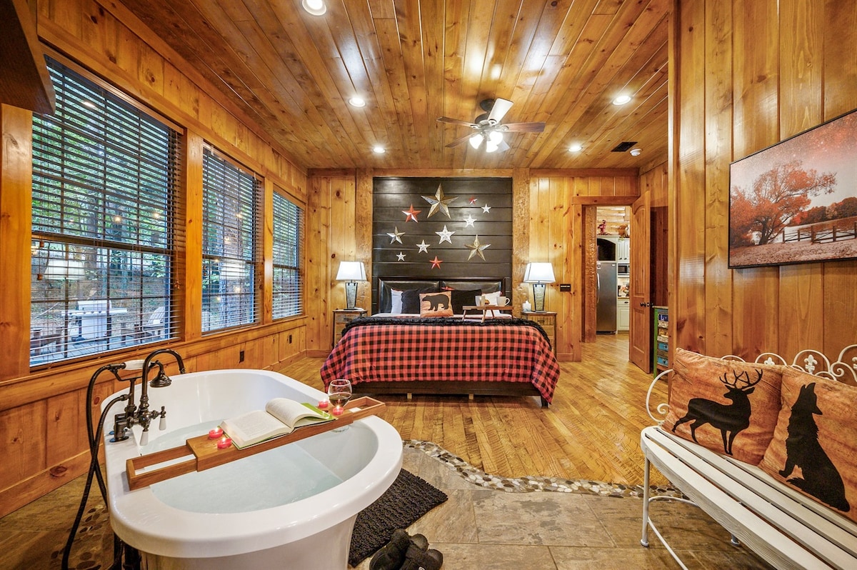 Welcome to Blushing Beaver, a romantic Scandinavian-style treehouse retreat for two. 🧖♀️ Nordic Barrel Sauna 🌊🌊 2 Creeks 🪢 Hanging Swing 🛁 Spa Bathroom w/ Dual Rainfall Showers 🔥 3 Fireplaces 💦 Hot Tub w/ Forest Views 🛏 Soaking Tub 🧖♀️ Robes 🧴 Beekman 1802 Luxury Toiletries ✭ "Romantic, peaceful, and still. Sitting on the side of a hill, looking into the trees. I would absolutely stay again. Website pictures are a true description"