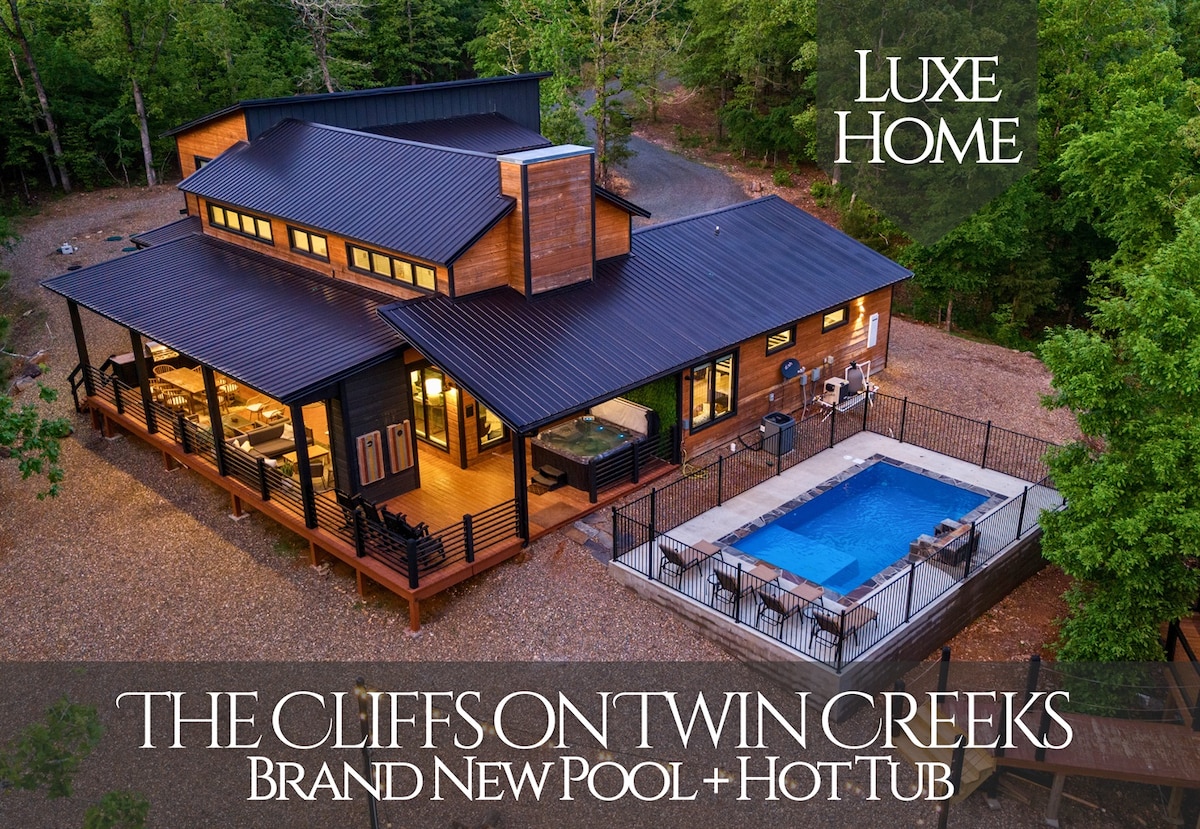 Escape to The Cliffs on Twin Creeks, a stunning mid-century modern cabin nestled on 3 serene acres in Broken Bow. This award-winning retreat features 4 king suites, fun-filled bunkrooms, a game room, a wrap-around porch with a hot tub and private heated pool coming April 1st. Enjoy luxury amenities like a chef’s kitchen, cozy fireplaces, and tranquil views of twin creeks. Please note: this property is not pet-friendly. However, we would be happy to recommend nearby pet-friendly cabins!