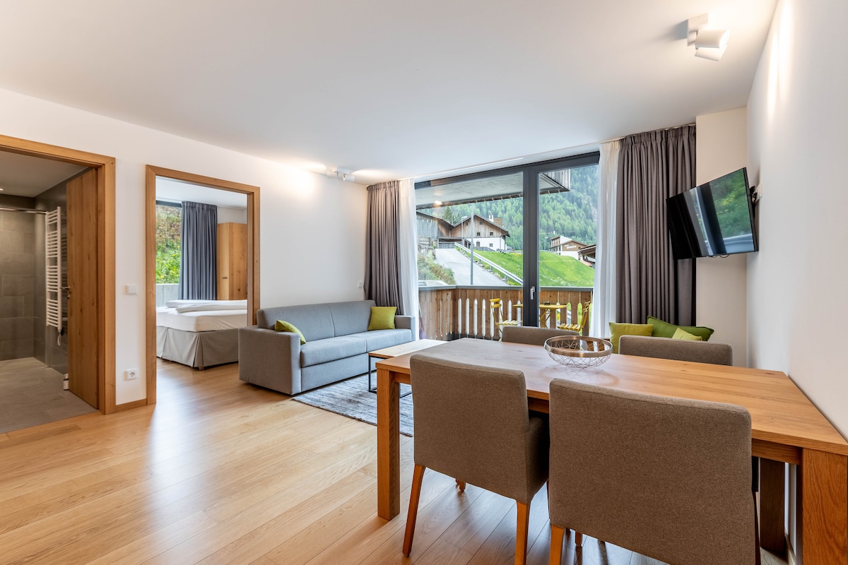 Deluxe Studio für 1-3 Personen - 26-33 m² - mit Balkon/Panormasitzfenster und Garagenplatz im Zentrum von Sölden. Küche mit Geschirrspüler, Kühlschrank, Kochfeld und Mikrowelle mit Backfunktion. Gräumige Dusche, WC, Dyson-Föhn sowie Hand- und Badetücher. Eine Wellnesstasche mit Bademantel für die gratis Nutzung des Wellnessbereichs in unserem gegenüberligenden Partnerhotel, Yoga-Matte, Rucksack für deine Abenteuer, Marshall-Laustprecher, flat-TV und gratis W-Lan stehen ebenfalls zur Verfügung.