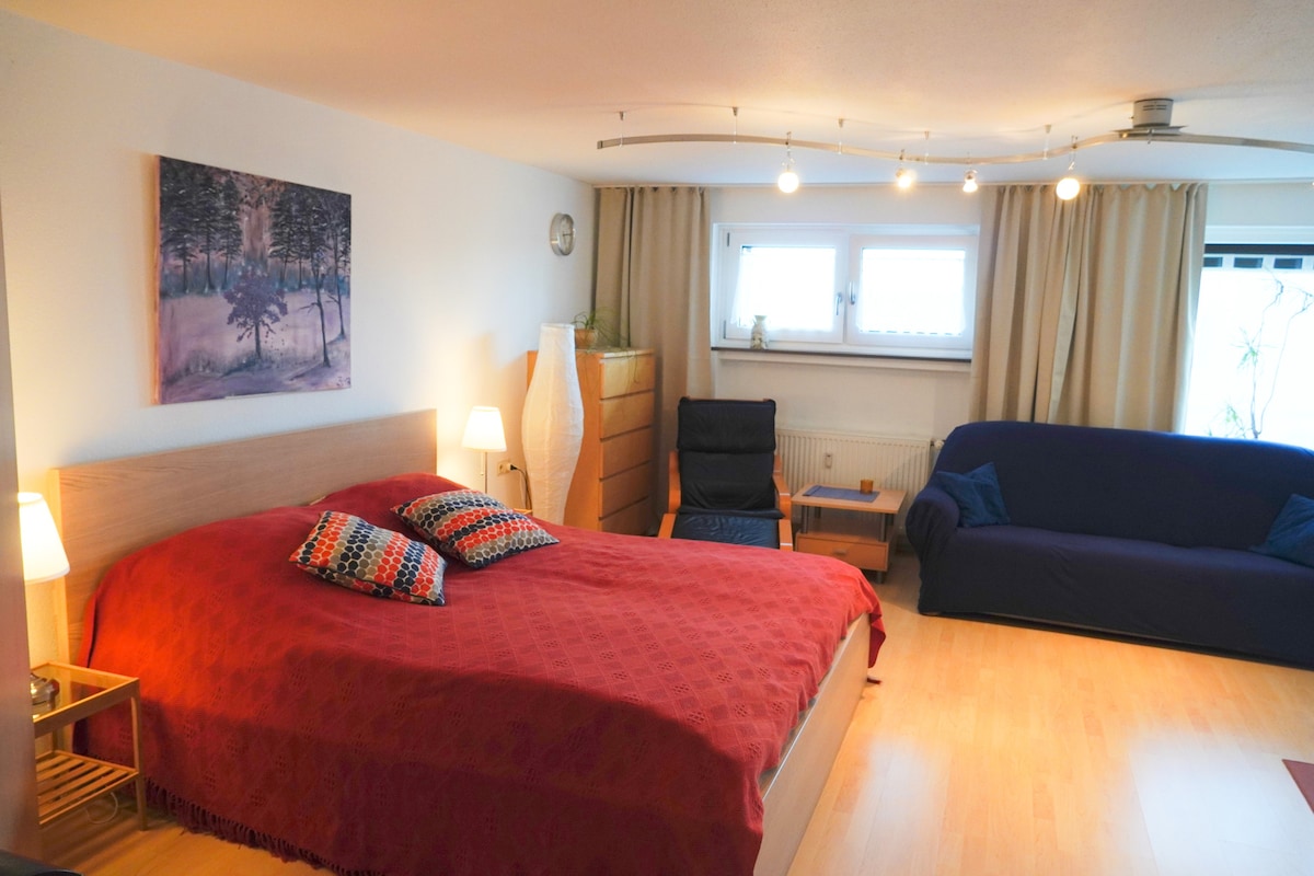Enjoy a few beautiful days in our cozy studio apartment in chalet style with large sunny south-facing terrace and Netflix. On the terrace is a lounge and a small dining table. Private parking space in the in-house underground garage. The village center can be reached in 10 minutes on foot. New kitchen with large ceramic hob and oven. Very comfortable and large bed 160x200 cm. The shower has a large rain shower head. We wish you a relaxing stay. Anna & Mike