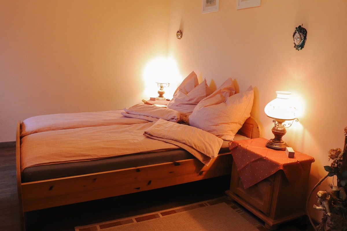 Das minimalistisch eingerichtete, helle und freundliche Gästezimmer befindet sich im ersten Stock einer Doppelhaushälfte. Zum Privatzimmer gehört ein Bad. Die große Dusche und der Blick ins Grüne entschädigen für die vier Schritte über den Flur. Ein nostalgischer Fernseher, viele Spiele, noch mehr Bücher und ein naturbelassener Garten laden zum Entspannen ein. Im Preis ist kein Frühstück enthalten. Das bereite ich gern gegen einen kleinen Aufpreis am Morgen frisch zu.