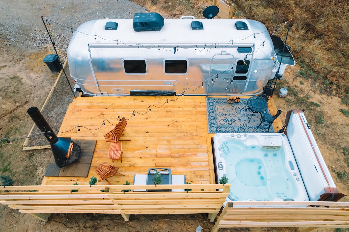 有趣的复古清风房车,有暖气、热水浴缸和景观