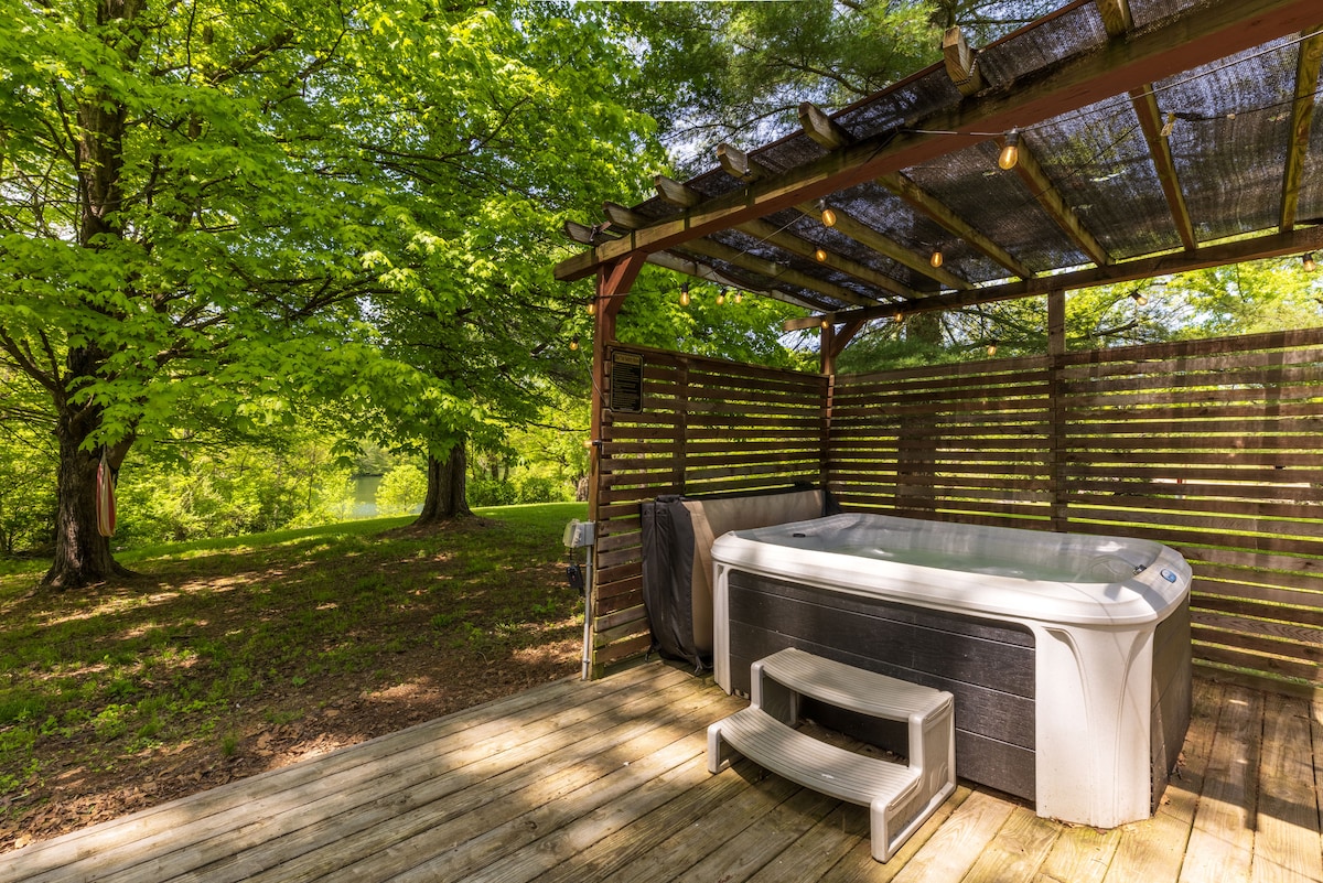 Trillium Ridge is located in Hocking Hills. A short drive to all local attractions or stay in to enjoy the fully equipped kitchen, hot tub, covered porch, balcony, fire pit and beautiful scenery! It is just a short walk or drive to the community lake where you can fish, swim, float,sun, or paddle around with your hand powered vessel. Indoors there's plenty of space to gather and more room to relax out on the deck or terrace. At the end of the day circle around the fire pit.