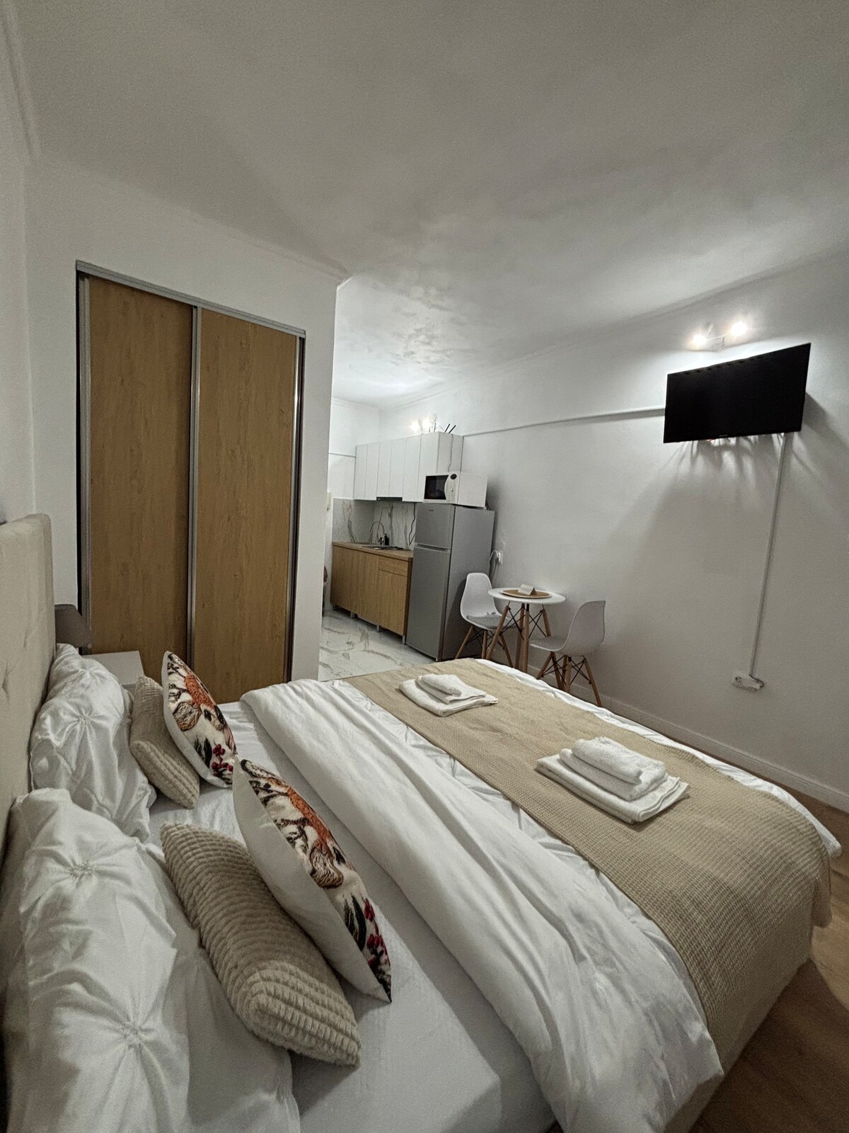 The apartment is situated in a new residential building, in the vicinity of Prima shops and Lotus retail park, where you can find many restaurants and shops. Inside the apartment everything is brand new, from modern custom furniture, to towels, bed linens, mattress, appliances and everything the kitchen is equipped with. You can enjoy a delicious coffee or a cup of tea. We have central underfloor heating and AC unit. Self check in after 2pm The capacity is for 3 people Free parking spot.