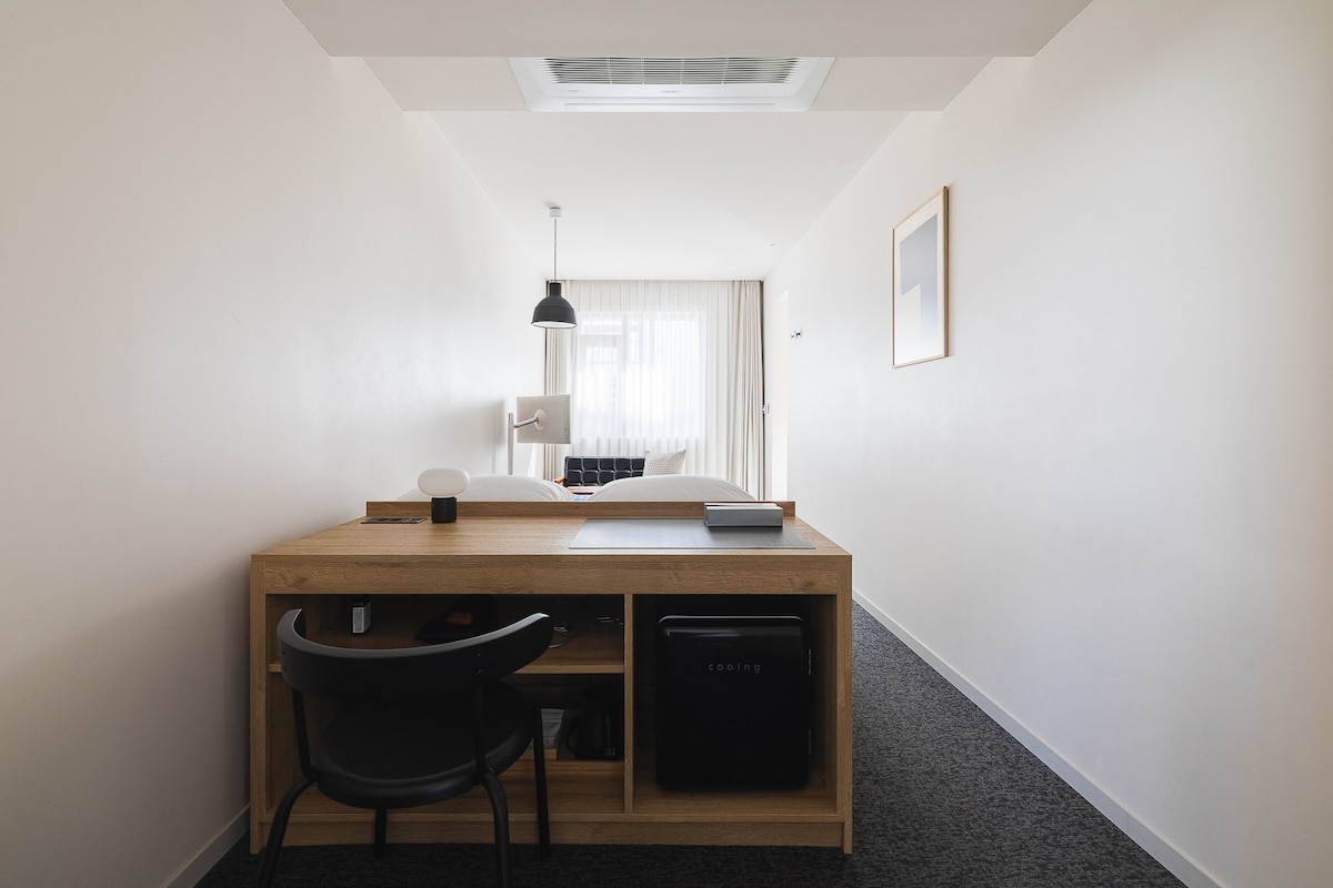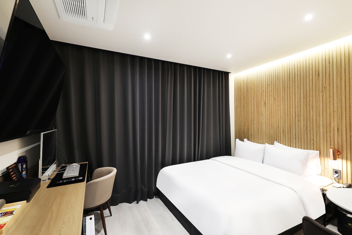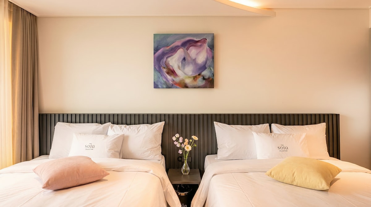 Queen Bed: 1 Occupancy: 2 (Max: 2) The moment you open the door, the high ceilings and rectangular layout evoke the exotic liberation of staying at a European boutique hotel. As the gentle sunlight filters over the ivory walls, the refined relaxation unique to 'Flat Tom' truly begins. Amidst the thoughtfully curated designer furniture, youโll find a leather sofa and tableโthe perfect spot to lean back, lose yourself in a book, or indulge in quiet contemplation.