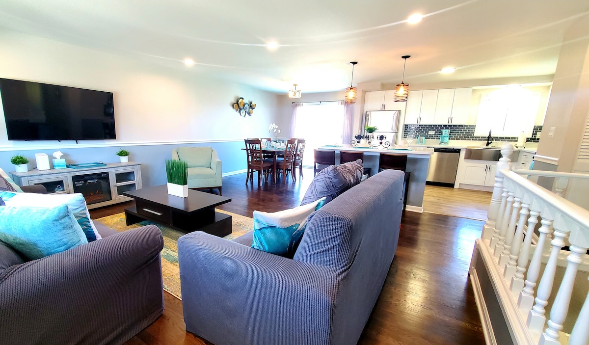 Experience a modern and quiet retreat in our big 4 Bedroom 2.5 Bathroom home. Perfect blend of comfort and convenience. Sleeps 9 people. Master Suite. Bedrooms: 3 King and Two Full Beds. 6 Smart TVs. Open floor plan with fully equipped kitchen where you can cook and create experiences with family. Big Fenced Back yard with a Big Deck. Parking 3 cars. Close to restaurants, shopping, trails, and parks. 6 miles to Schaumburg Convention Center, 17 miles to O'Hare Airport, 5 miles to Woodfield Mall